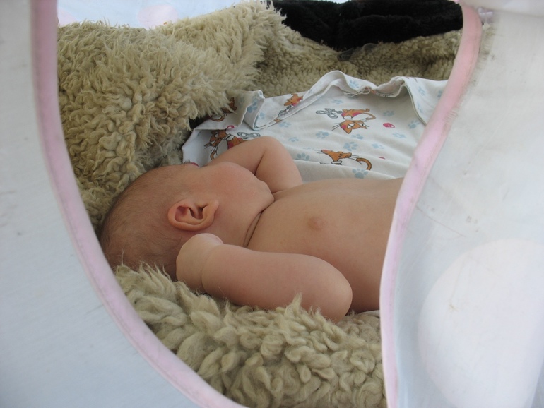 Для грудничков у нас есть маленькая палатка ещё со времён Ёжика. Потрепалась и выцвела она изрядно, но служит нам всё так же верно. В ней детки спят хорошо: насекомые не кусают, ветер обдувает, солнце не жарит. Вот и в это лето, искупаем сына, накормлю его и в палатку спать отправляем. Часто Малышарик не спит, а рассматривает через сетку окружающий мир.