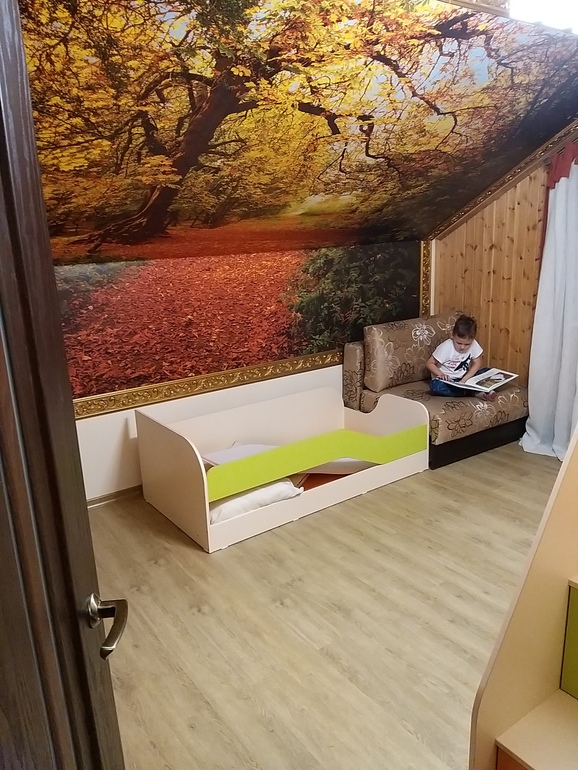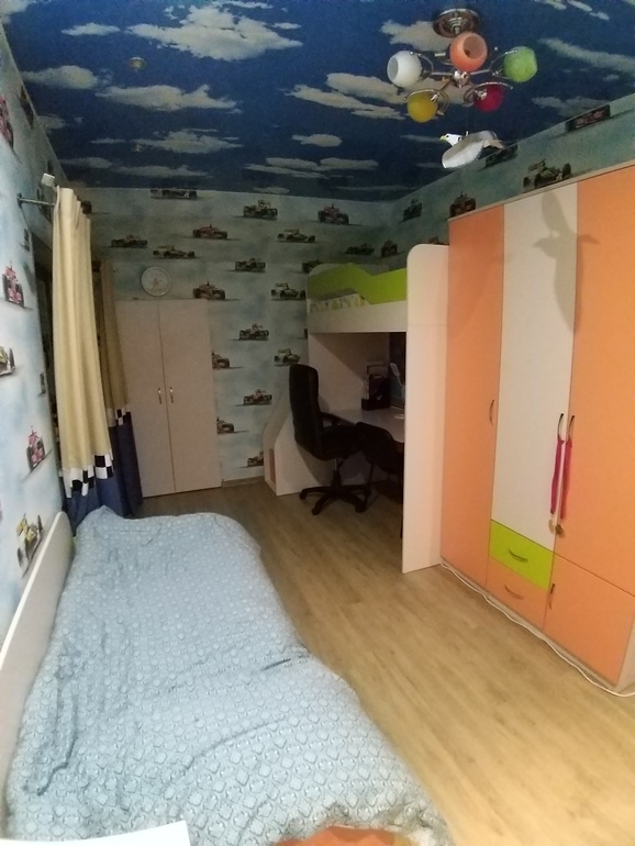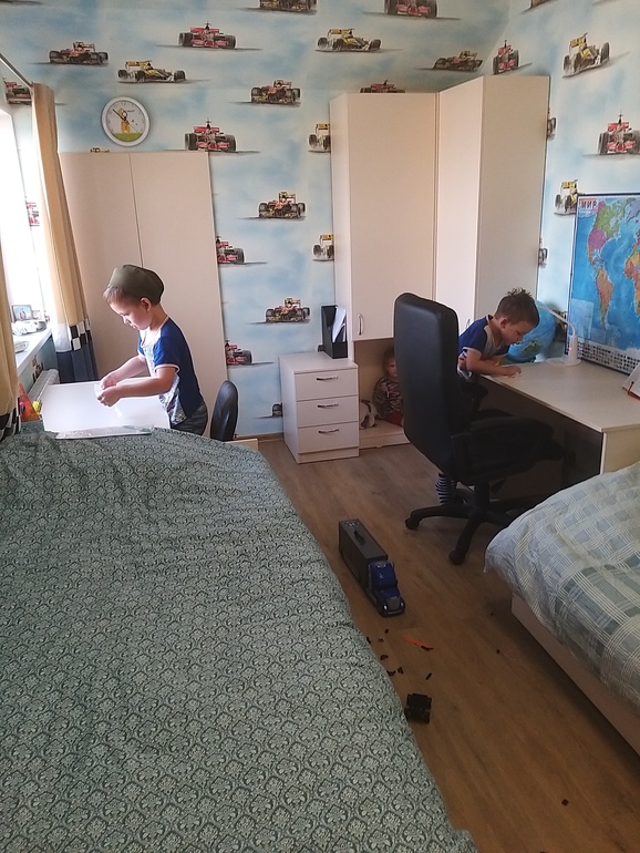 Понимаю что с детьми ремонт это сложно. Но все же обои нужно было поменять ( совсем не сосчитаются с мебелью) . И очень смущает расположение второго стола в детской мальчиков. Свет ( окно) за спиной это не лучше решение. Может нужно было столы поставить по стене где шкаф с игрушками?