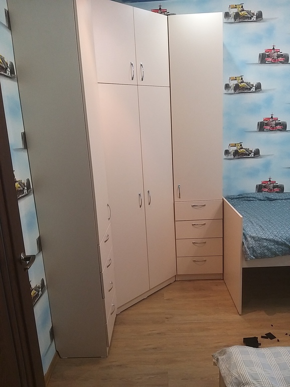 У каждого свой шкафчик и общий угловой отдел с вешалками и местом для постельного белья.
