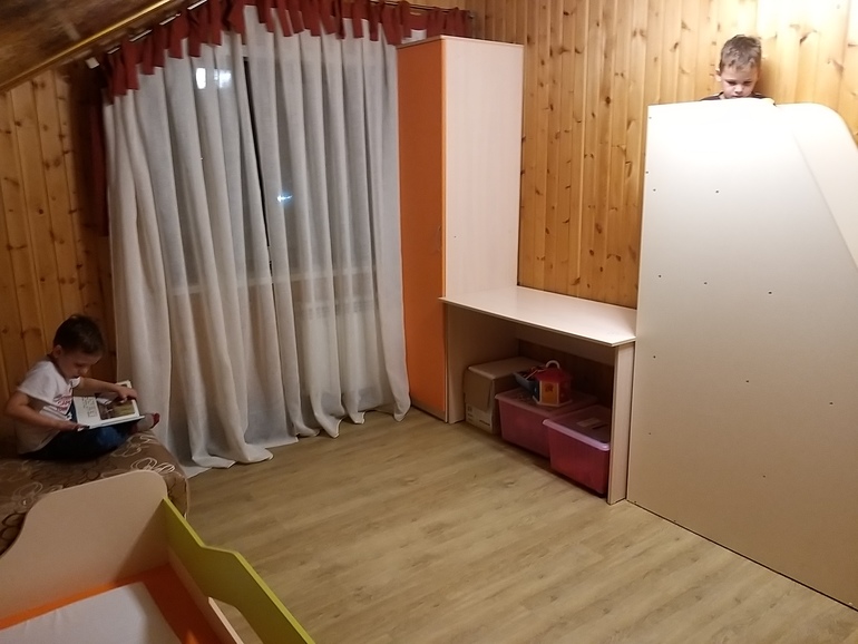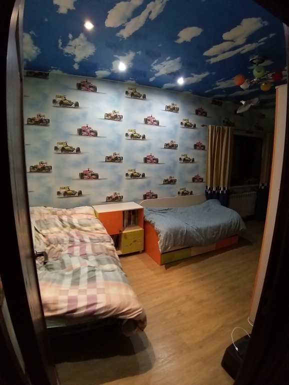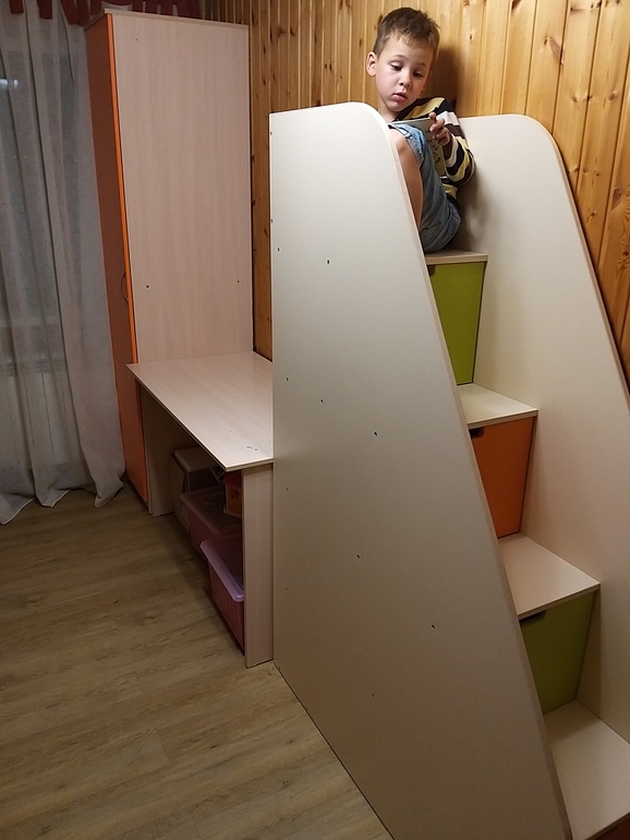 Кровать справа закатывается под кровать, которая слева. Освобождается мнооого места) Оранжевый шкаф переехал к доче в комнату.