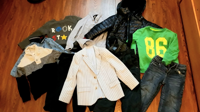 Вещи: теплая курточка, штанишки на флисе, утепленные джинсы, пиджачок, флисовая кофта, 2 пары штанишек, тонкий свитер, утепленный лонгслив, рубашка и поло с длинным рукавом