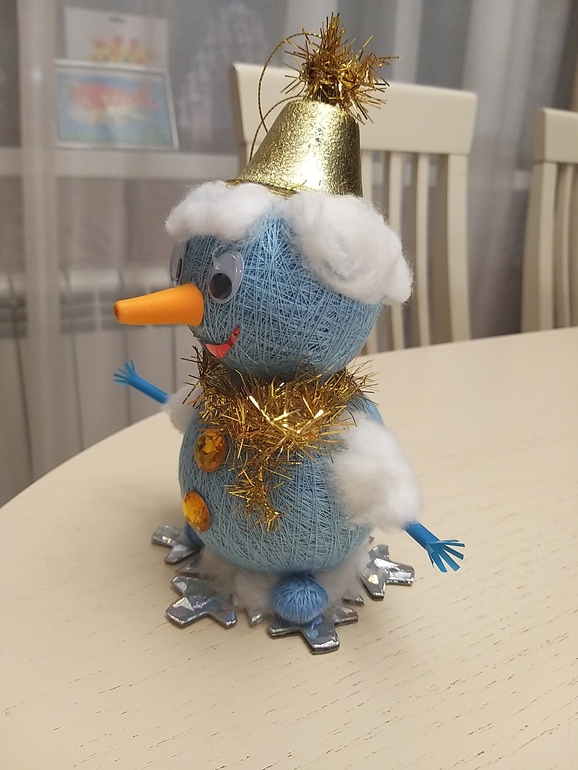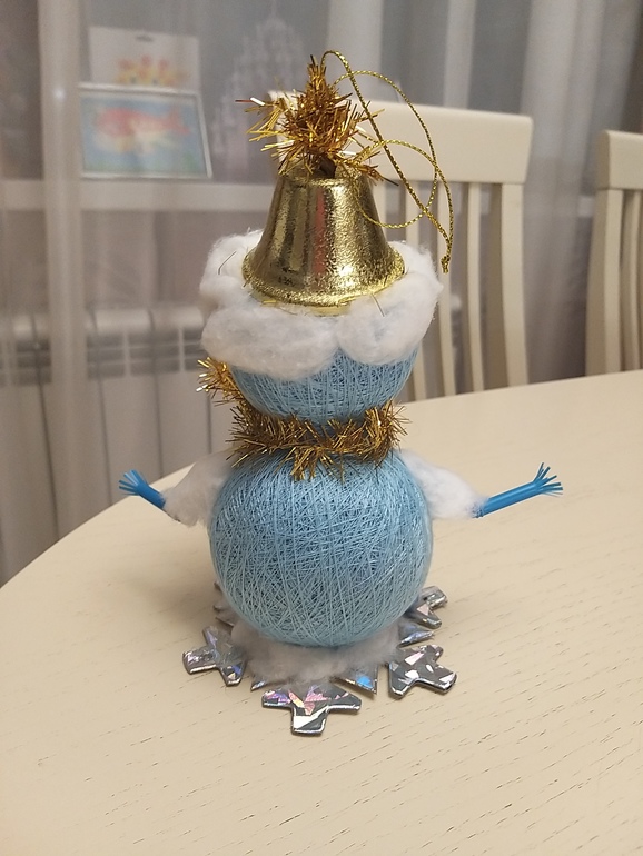 Нам понадобилось 2 пенопластовых шарика 6 и 7 см. Сначала обмотали голубой шерстью, а поверх наматывали простую нить. Второй шарик увеличили в объёме за счет шерстяной нити. Так нам показалось симпатичнее) склеили голову и туловище пистолетом. И место соединения я тоже обмотала шерстяной нитью. Так шея получилась без резких переходов. На голову приклеили ватные волосы и колокольчик) и не надо дополнительно мастерить ведро, очень симпатично и быстро, что для нас было очень важно. Руки сделали из трубочек, приклеила также пистолетом. Чтобы скрыть некрасивые места, прикрыли опять же ватой. Получились рукава) Фигура получилась у нас крайне неустойчивая, поэтому подставочку сделали из снежинок. Сначала приклеила одну, но потом поняла, что надёжнее будет подставка из двух одинаковых снежинок. Побольше клея из пистолета и снеговичок крепко стоял на снежинках. Место склеивания опять же прикрыли ватой. Для ножек скатала два ватных шарика и обмотала их шерстяной ниткой. Приклеила пистолетом. Глазки были у нас готовенькие, улыбку вырезали из глянцевой бумаги, а нос достался от прошлогоднего снеговика. Для яркости добавили мишуру и пуговки) мне кажется мы никогда еще так быстро не делали поделку. За 2.5 часа уложились. Это наш первый рекорд) Завтра приступаем ко второй поделке ...