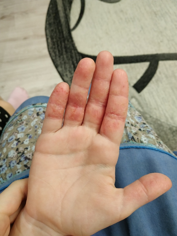 Здоровье детейДевчонки, подскажите, возможно кто-то сталкивался с такой проблемой. У дочки на одной руки, именно на пальцах- вот такая беда. Кожа сухая, трескается , чешется, а потом появляются раны..