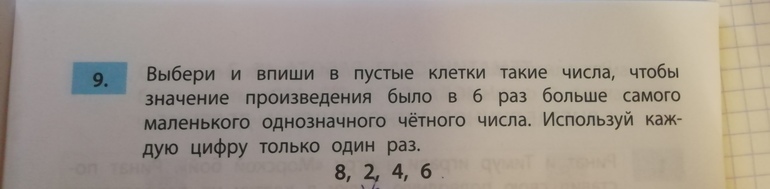 А пустые клетки то где, куда вписывать? Я так понимаю, что нужно вставить эти числа в примеры, чтобы в итоге получилось 12 (В 6 раз больше чем 2).