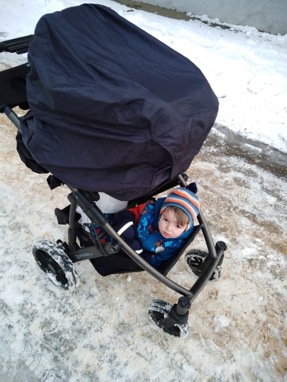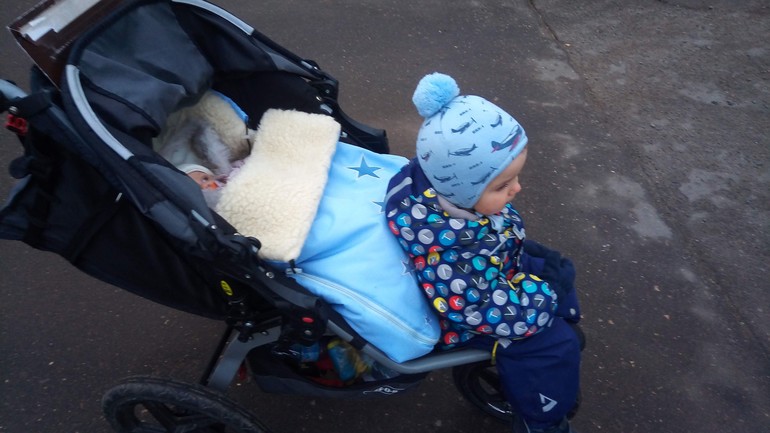 Коляска для погодок паровозиком есть, но ее я не вижу в эксплуатации. Во-первых колеса не для данной местности, во-вторых не совсем уже для нашей ситуации, т.к. старший ребёнок все же не нуждается именно в полноценном сиденье.
