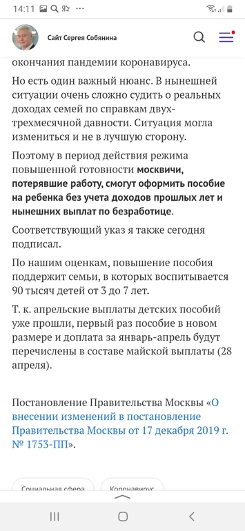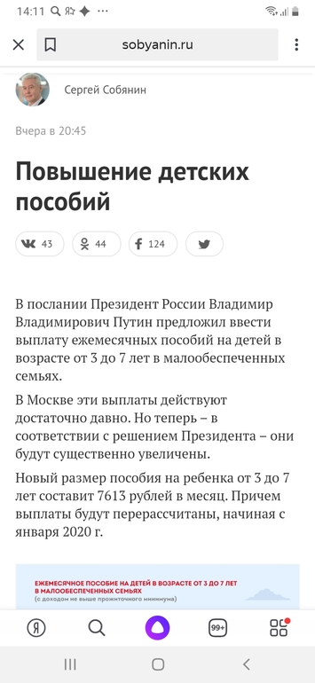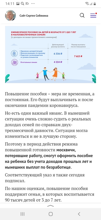 В середине января в послании Федеральному собранию президент Владимир Путин анонсировал введение ежемесячных выплат семьям, в которых есть дети от трех до семи лет и доход которых ниже прожиточного минимума. В своем пятничном обращении мэр Москвы подчеркнул, что такие выплаты в столице действуют уже давно, «но теперь - в соответствии с решением президента - они будут существенно увеличены». В ходе послания Путин заявил, что размер выплат будет зависеть от уровня прожиточного минимума в регионе.