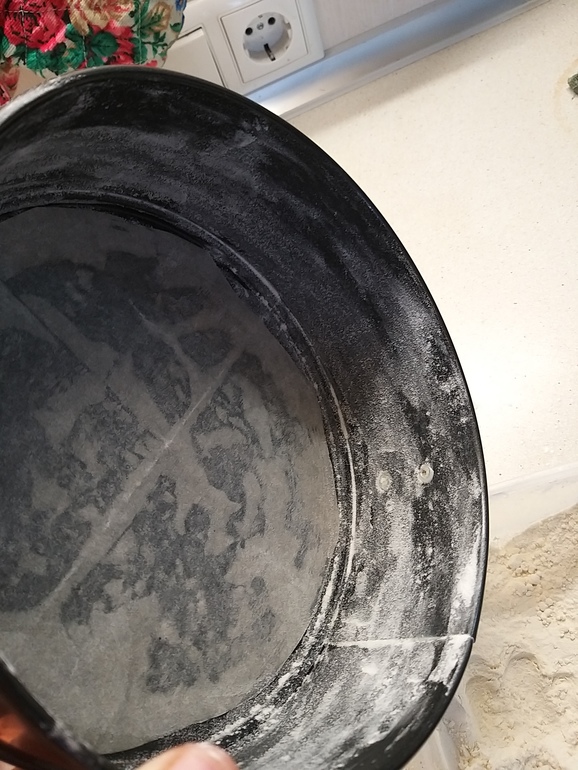 У меня разъемная форма на 18 см. На дно выкладываю пергамент, а по бокам мы делаем "французскую рубашку") для этого края смазываем холодным сливочным маслом и посыпаем мукой. Излишки муки легко отлетают при переворачивании формы)