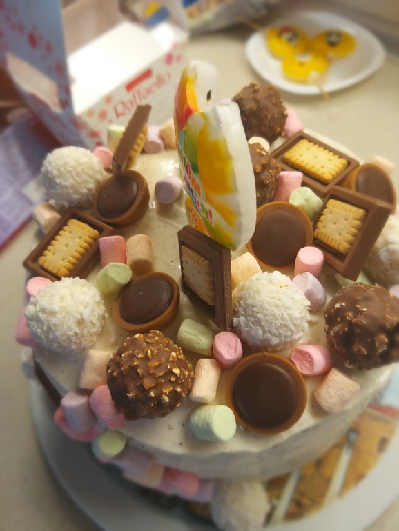 Украшаю торт.. Выбираю разные шоколадки типа вдохновения или кит-кат, Рафаэлло, вообщем подойдёт всё))) но сразу скажу М@Мs и другие на них похожие драже красится и выглядят не красиво. Меллер и тофиффи тоже красится, но не так критично. Фрукты и ягоды использую только свежие. Заморозка мне не нравится. Нравится нарезать разноцветный мармелад) получаются как прозрачные цветные "стеклышки")