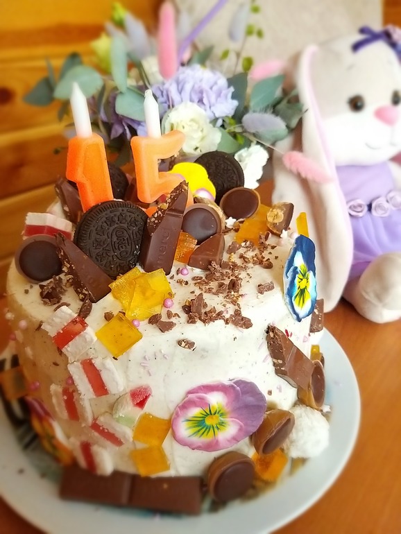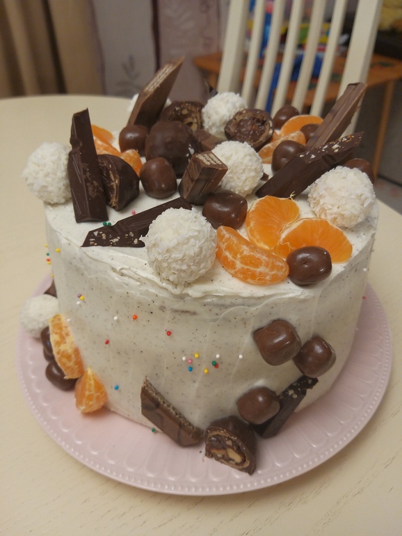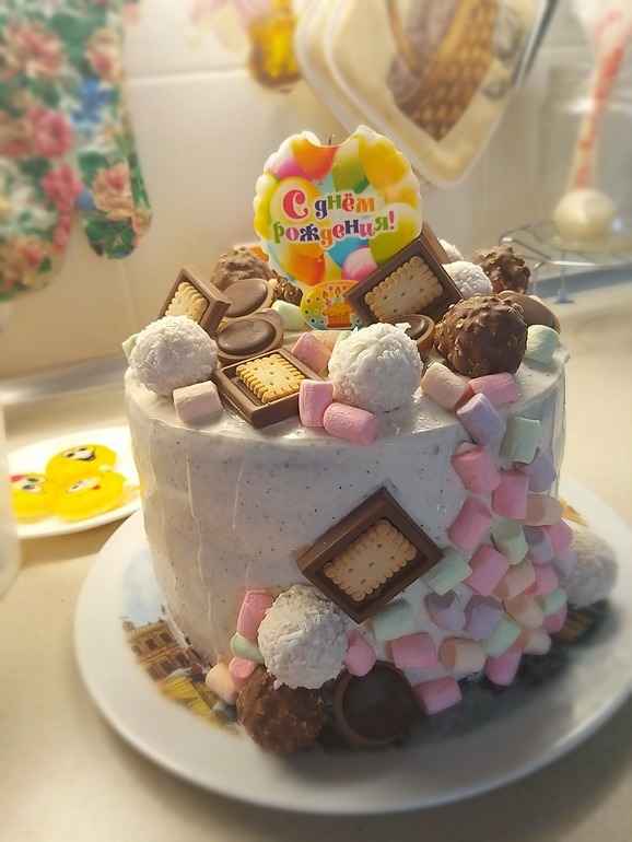 Ну и конечно надеюсь, что покажешь свой шедевр)))) в то у меня скоро фантазия иссякнет))) мои каждый раз просят добавить ещё больше шоколадок🤪🤦♀️ у меня и так на торте свободного места нет))) а все равно кому-то чего-то не хватило🤣🤣🤣