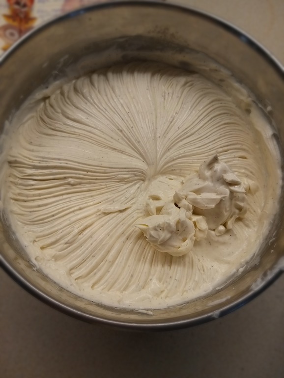 Крем должен быть однородным и держать форму. Если вам кажется, что крем жидковат, то надо добавить творожного сыра. Готовый крем закрываем в контакт пищевой плёнкой. И ставим в холодильник. И продолжаем колдовать с начинкой)