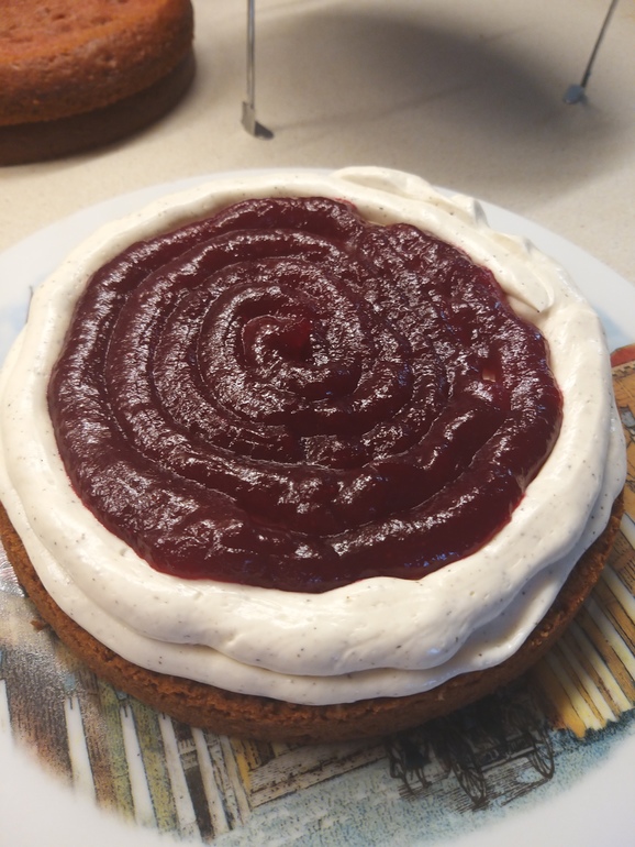 И на первый корж делаем еще бортик из крем-чиз, а внутрь укладываем конфи или курд.