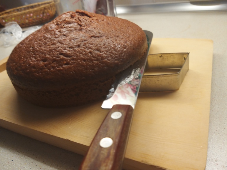Для начала делим коржи на 2 части. Лучше всего с этим справляется нож для хлеба и формочка для печенья)