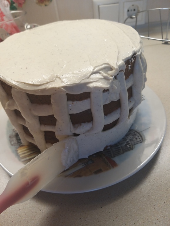 Выдавливаем по бокам полоски примерно на одинаковом расстоянии. Получается такая сеточка по всему торту. И лопаткой начинаем выравнивать боковинки и верх торта
