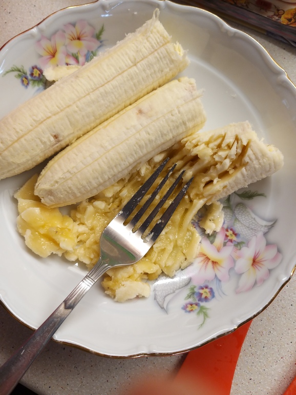 А во второй миске разминаем вилкой большой банан (у меня получилось 1.5 средненьких).