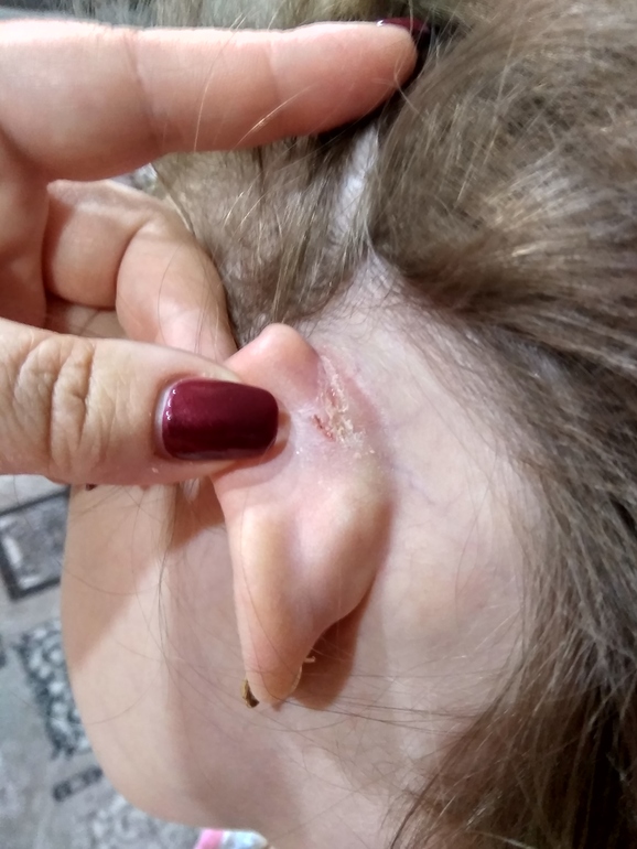 За у шами не встречала таких корочек, а вот на глазу у меня самой был глазной герпес. Он не был похож на тот, который вылезает на губе, шишка с пузырьками. Герпес расплылся под глазом в зудящее, красное пятно, и я подумала, что у меня лишай. Врач в итоге лечил меня от герпеса.