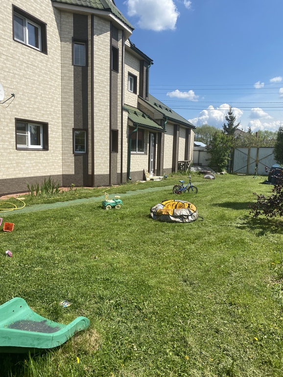 Рулонный газон у нас высох. Мы наверное что-то не правильно сделали. Поэтому сейчас просто густо подсеиваю газоном и граблями, чтоб земля асфальтом не была. Но повторю основные дорожки - искусственное покрытие. Нужно или плитку, но жестко или коврики в рулонах под травку.