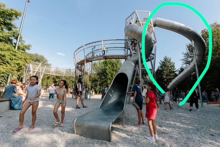На следующий день пошла с детьми в парк им. Горького. Нашли крутую детскую площадку с огромными горками и лазалками. Дети были в восторге! Я просмотрела глазами, вроде все безопасно, везде натянуты сетки.