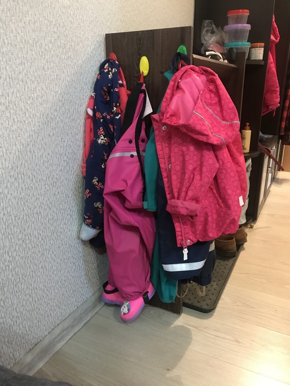У меня стоит резиновый коврик-поддон, куда ставлю сапоги. Одеваю обувь детям в последнюю очередь.
