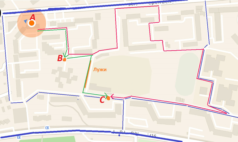 А какое еще развлечение им можно придумать? Крюк делать - активность сомнительная. Мы на холме живем, и дорога в сад и дальше за водой, на почту - это спуск с горы, потом обратно в горку (слева направо по карте спуск). Чем больше крюк - тем больше потом обратно в гору пилить. Вот нарисовала, А - дом, В - сад, С - вода, почта. Зеленая - наш маршрут. Розовая - крюк, глянь какой! Синяя - дороги, по которым гоняют машины на скоростях. Наверху синяя - проезждая часть с троллейбусами. Внизу синяя - объездная города, фуры на скорости пролетают. Там вообще не расслабишься и Лешу не выпустишь пока. По центру синяя - машины срезают себе маршрут + едут в гору, поэтому всегда разгоняются.