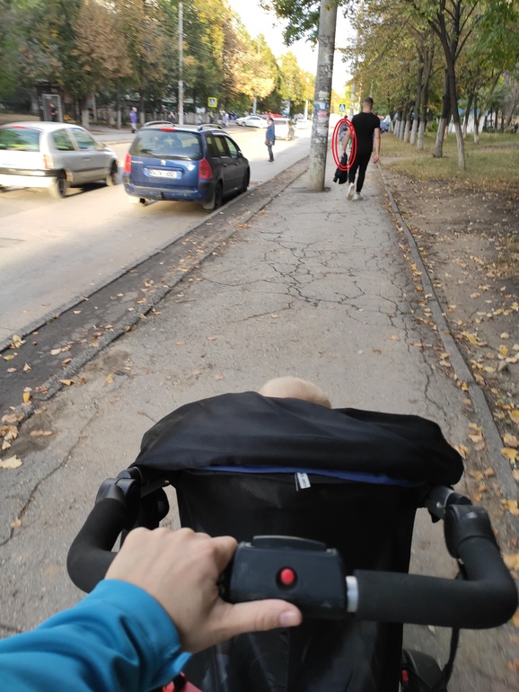 А это фото сегодняшнее - сделано как раз по маршруту крюка - где верхняя синяя дорога. И красным обведен - Илья на самокате, и так пепреживаешь у дороги. Если туда еще и бесстрашных Мишу с Лешей отпустить, вообще кошмар.