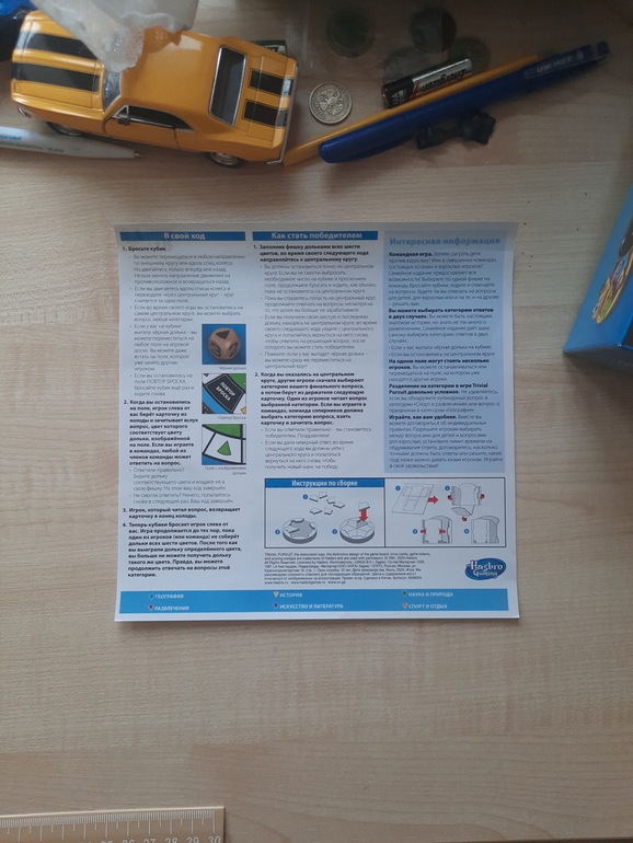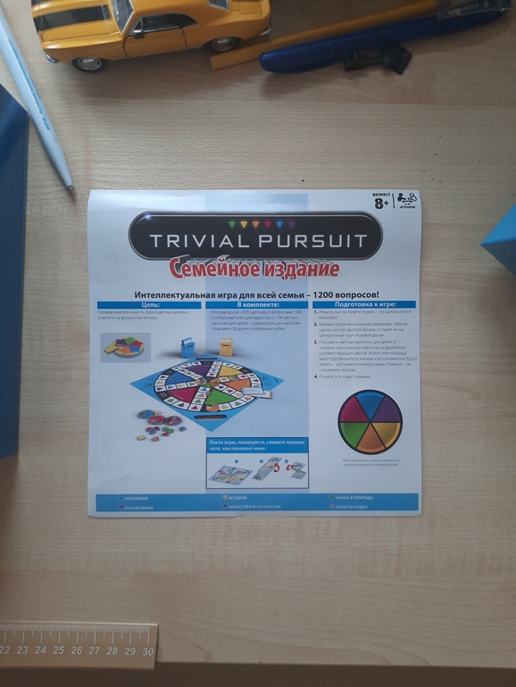 Купили в магните trivial...... Сыну 11 лет, понравилась, много разных вопросов на разные темы, для детей карточки с вопросами одного цвета, у взрослых другого. Моему понравилась игра. Мне качество.