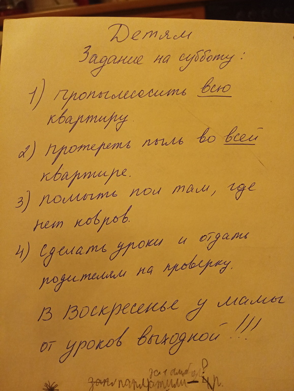 Это детям, плюс ежедневно каждый у себя в комнате порядок на рабочем столе, с пола всё поднять, одежда по местам.