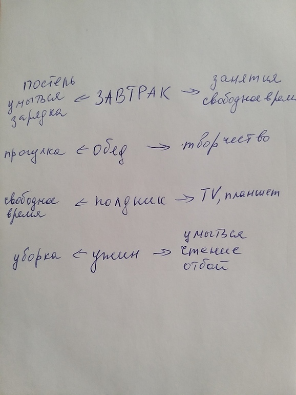 Понятие времени конечно в таком возрасте ноль, но привязка к приёму пищи отличная. Для начала мы определи, что необходимо сделать до завтрака!! И написали: заправить постель, умыться, зарядка.