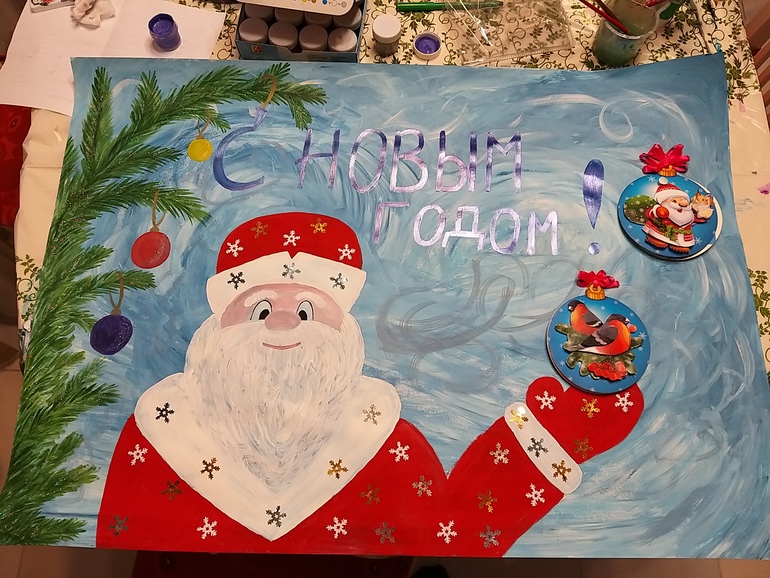 А это наш плакат) парни помогали украшать снежинками, блёстками и сделали 3д открытки с поздравлениями) вот еще наше совместное время провождение)