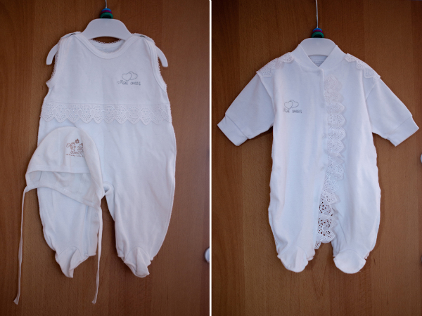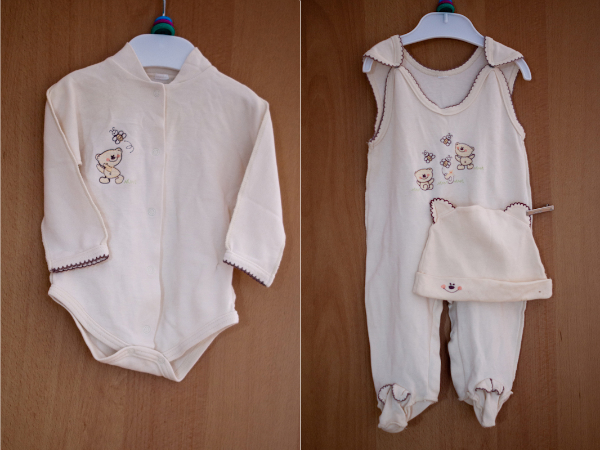 Белый (комбинезон без рукавов, шапочка, комбинезон с длинными рукавами) и бежевый (Боди с длинными руковами, шапочка, комбинезон без рукавов), был подарен и отложен, т.к. был нам большой. Потом я про него вспомнила, постирала, но уже они оказались маленькими, так что не ношенный.