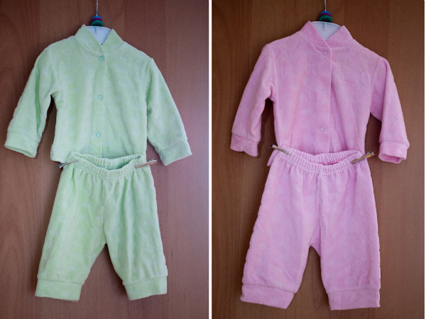Розовый и зеленый комплект из велюра (Кофточка и штанишки), одет пару раз и то только для того чтобы сфотографироваться. Цена 200 р каждого.