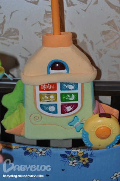 Домик имеет отделения куда можно сажать игрушки, его можно ставить на пол. Игрушки от карусельки мягконабивные с шуршалками.