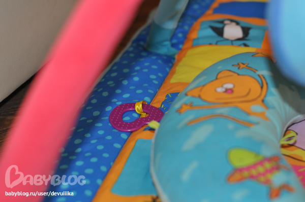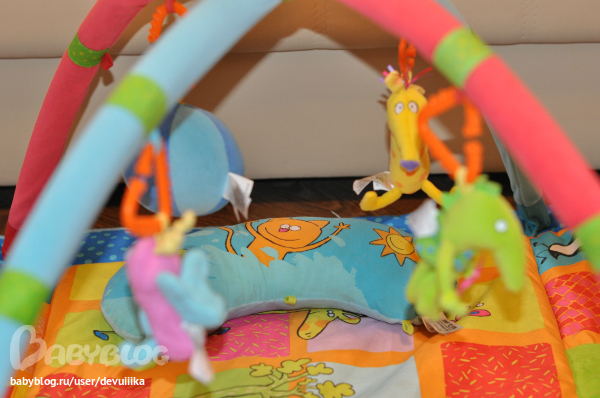 В комплект также входит подушечка для удобства игры, лёжа на животе, что побуждает малыша к поднятию головы и плеч и способствует развитию навыков крупной моторики.