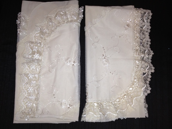 Уголки на выписку( новые, так и не воспользовалась, т.к. выписывались в комбезах) Очень красивые, цвет молока. Цена по 500 рублей