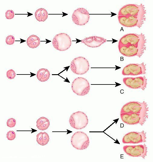 (А - монохориальная диамниотическая двойня): наиболее распространенный вариант однояйцевой двойни. Если деление происходит на стадии бластоциста, когда центральные клетки группируются не в одном месте, а в двух, то близнецы будут иметь общую плаценту, но два отдельных амниотических пузыря;