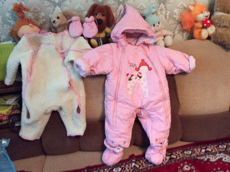 1. Комбинезон-трансформер на девочку. Цвет розовый. Рост 74. В комплекте рукавички и пинетки. Овчина отстегивается и комбез можно носить осенью и весной. Также есть змейка между ног, можно сделать конверт и носить с рождения. Цена 1000 руб.