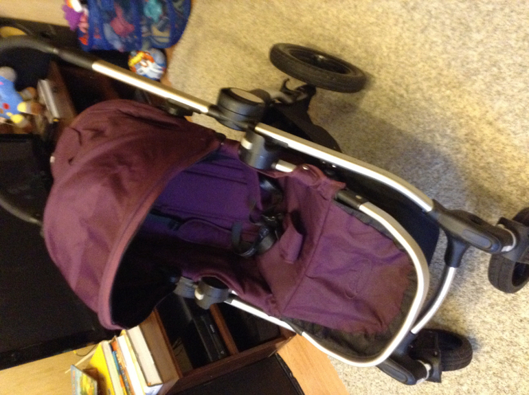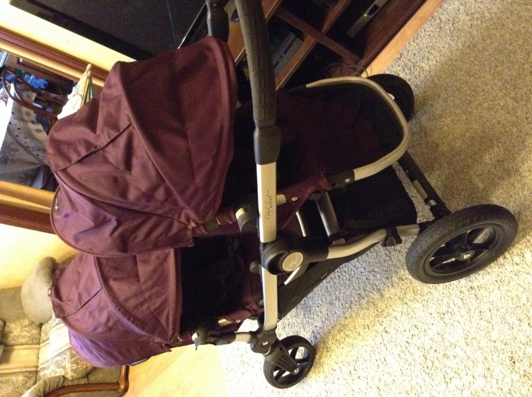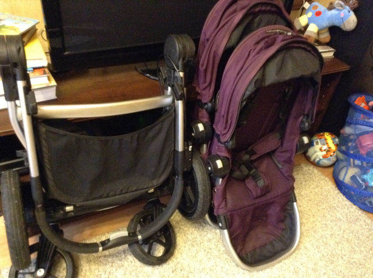 В комплект входит рама, два прогулочных блока, два дождевика (новые абсолбтно, оригинальные). Цвет фиолетовый.