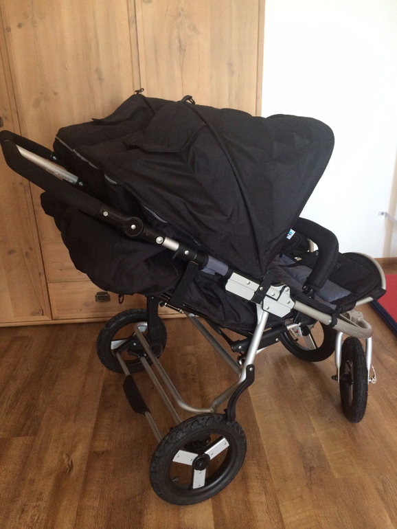 В комплекте: две люльки-переноски с жестким каркасом (carrycots), два прогулочных блока, два бампера, насос, дождевик - на два места.