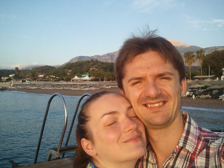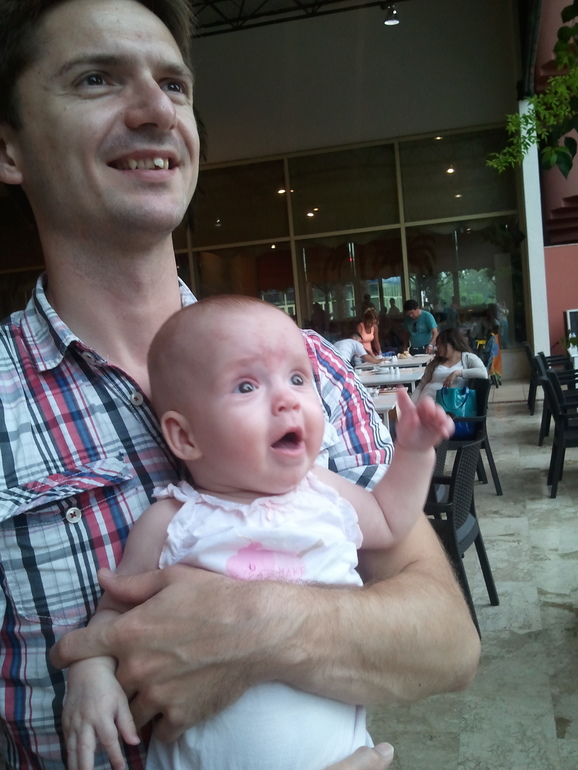 Итак, поехали) Выезд из дома у нас был в час ночи, детей я уложила спать уже в одежде для поездки, выносили в машину спящими, уложили в кресла в машине, загрузились и поехали. Детки всю дорогу до аэропорта спали. В аэропорту прошли регистрацию, сдали багаж, детки так же мирно спали в коляске. Проснулись они уже после досмотра ручной клади. Перед полетом мы их посадили в рюкзаки, этого можно было и не делать, коляску мы оставили прямо перед входом в самолет. В самолете девочки достаточно спокойно себя вели, мы их покормили, потом они немного покапризничали, достаточно быстро уснули, так как все-таки было время сна (вылет в 5 утра), хотя происходило что то необычное для них). При взлете и при посадке мы давали им сосать пустышки, так что полет туда они перенесли достаточно легко, а вот мы дико хотели спать)) удалось немного вздремнуть, но совсем немного)). И вот мы прилетели в Турцию! Долго ждали, когда же нам отдадут коляску, их выдавали почти там же где и багаж, только ждали их намного дольше, чем чемодан. А может мне показалось, так как очень уж хотелось уже быстрее добраться до отеля. Итак, отдали нам коляску и двинули мы искать наш трансфер до отеля) На улице жарень! А мы одетые) Девчушки наши по прилету проснулись, лупились во все стороны, все им было интересно) Нашли трансфер, загрузились, поехали! Ехали примерно час на достаточно комфортном большом автобусе, там мы еще раз покормили деток. Приехали, ура!