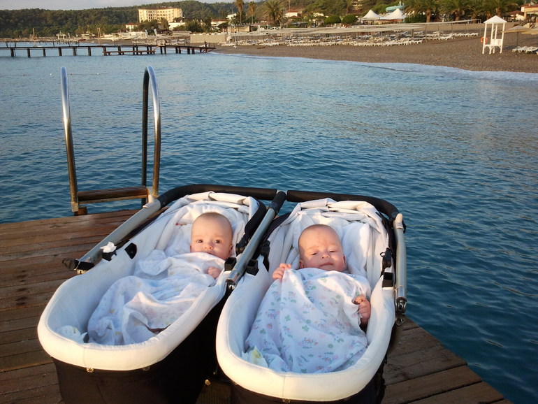 Поначалу было страшновато как они будут реагировать на жару, хотя мы самый солнцепек и находились в номере, но все равно, и купание в море, но страхи быстро прошли, так как им похоже даже нравилось) во время купания они никогда не плакали, начинались капризули только после купания, когда их пытались положить в коляску, а им хотелось продолжать сидеть на ручках
