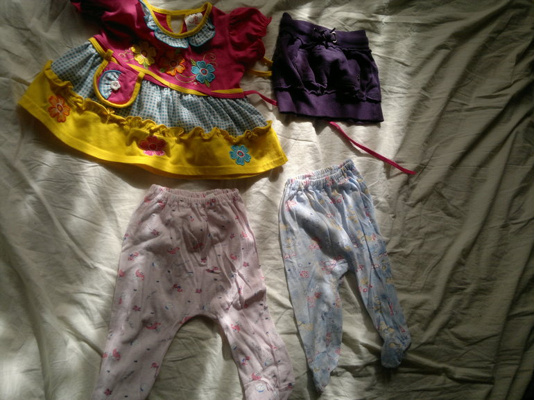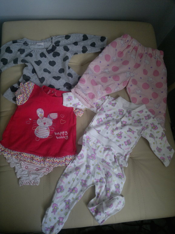 Отдам даром несколько вещей: комбинезончик на прохладное лето, теплую весну (babyG 62), полукомбинезон утепленный (60 см/3 мес, и в 6-9 мес нам влезало) с бретельками (на фото их нет) фирмы не знаю, юбка prenatal 68, платье-песочник (кот-маркот по-моему на 6 мес), платье-песочник bolichin 68, платье с длинными рукавами (baby by lyndex 56, но хорошо и на 62,на 56 нам было великовато), 4 боди (playtoday 3-6 мес), платье (размер не знаю, написано тайланд размер 1, но точно не на год), пижама, которую в роддоме давали (вспомнила поздно, одели два раза) и две пары ползунков - лежат зачем-то без дела.
