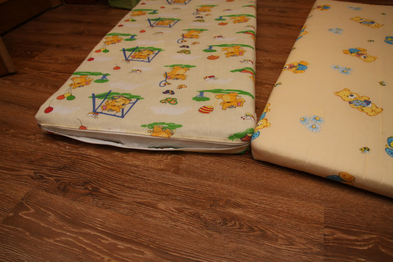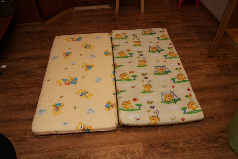 Отдам в придачу 2 матраса, тоже из детского мира. Он жесткий с одной стороны. На одном разошлась молния. Пока дети были маленькие-я часто гладила матрасы утюгом, поэтому кое где есть следы от него.