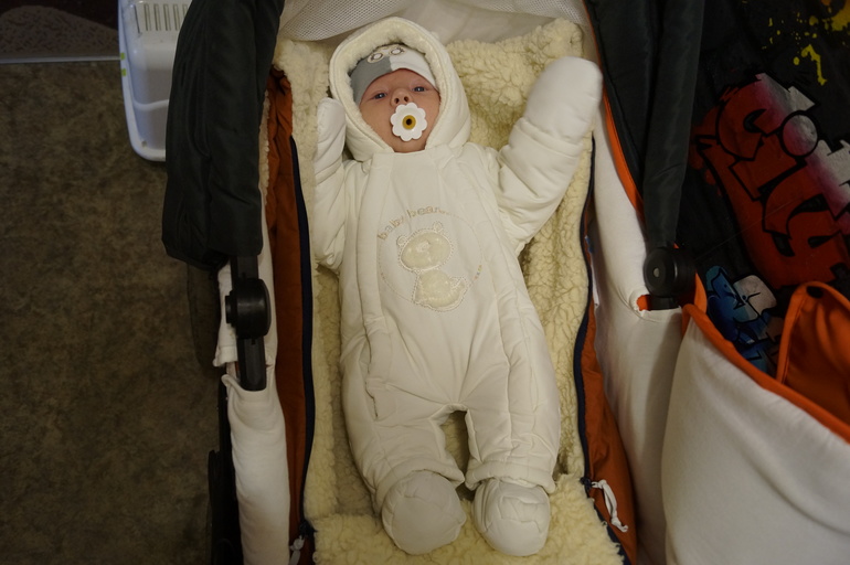 А вот в автолюльках мы ездить будем после месяца к врачам, так что без комбезов нам никак.