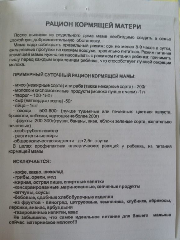 Отдам даром детские товары/аптека.А у меня вот что из головы не выходит: на курсах давали список еды, который можно употребоять в первые месяцы после родов(при ГВ), а я его потеряла где-то, подскажите, кто владеет информацией, что можно есть, чтоб на ребенке не отразилось.