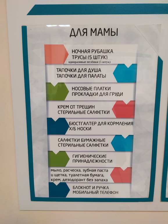 Ещё добавлю от себя: одноразовые накладки на унитаз, одноразовые трусы, прокладки послеродовые, т.к. у меня КС- чулки компрессионные и бандаж послеродовой, и препараты- свечи глицериновые от запора, от изжоги , гигиеническую помаду.