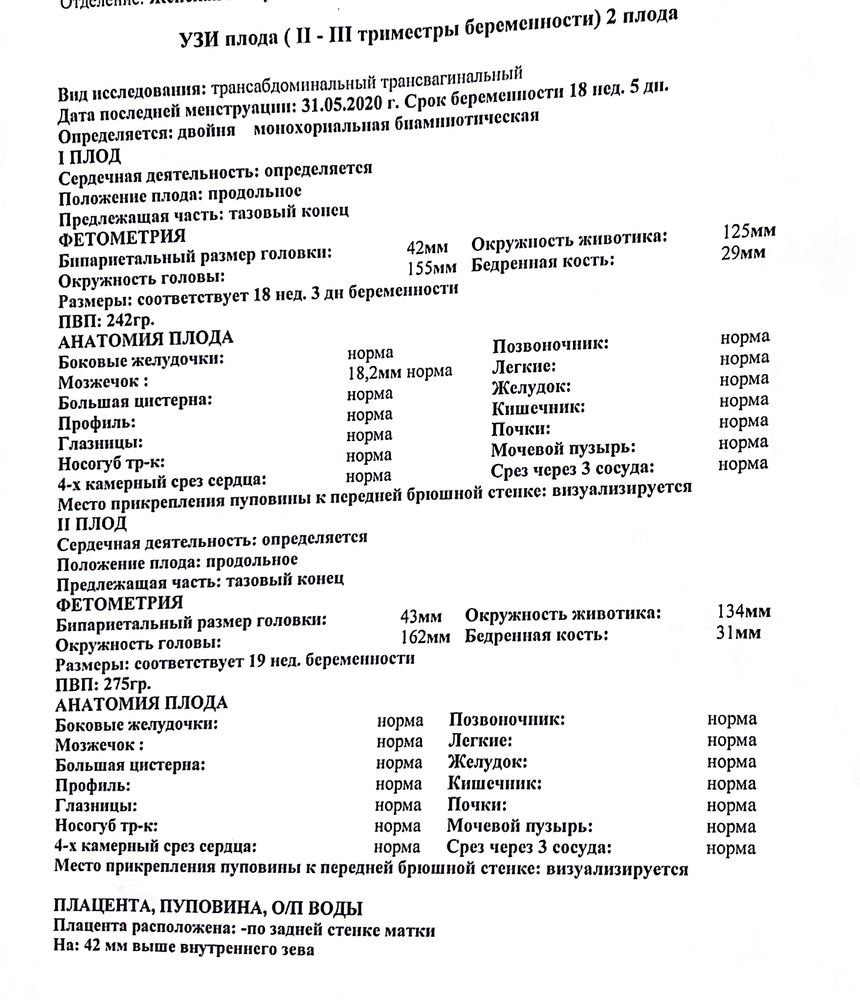 1ребенок-18 недель и 3 дня;2ребенок-19недель ровно.Разница в весе у мальчишек 42 грамма (242г и 275г).Гиперэхогенные включения в околоплодных водах замечают с 16 недели. Но по всем анализам у меня нет инфекций. Гипертонус миометрия. Такие дела пока. УЗИ прикрепляю для будущих мамочек.