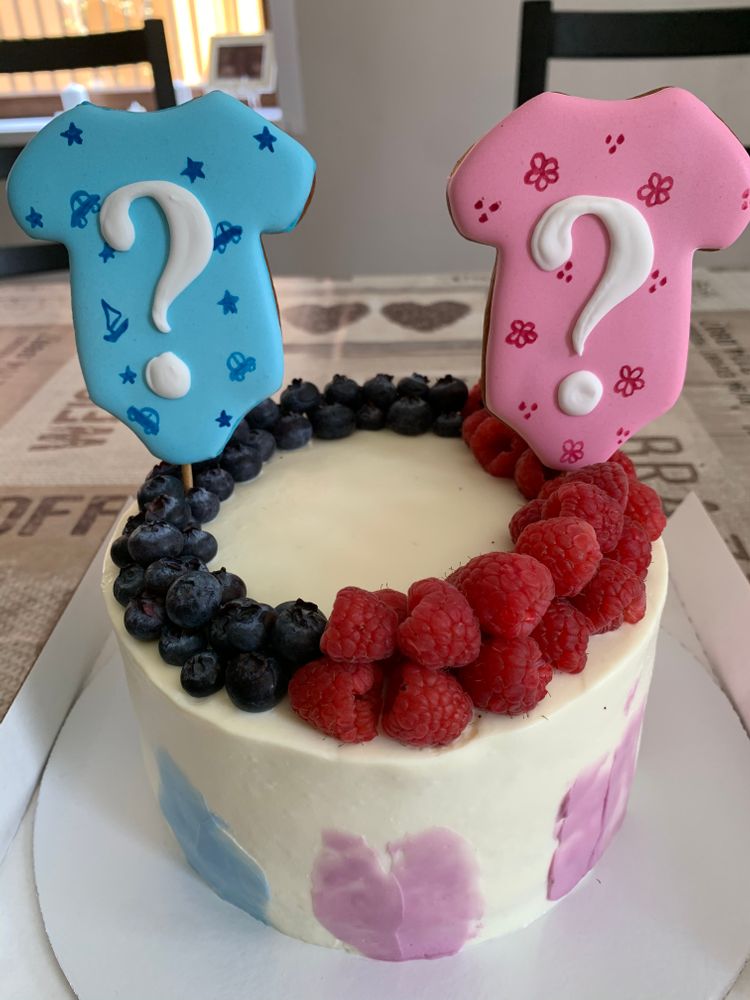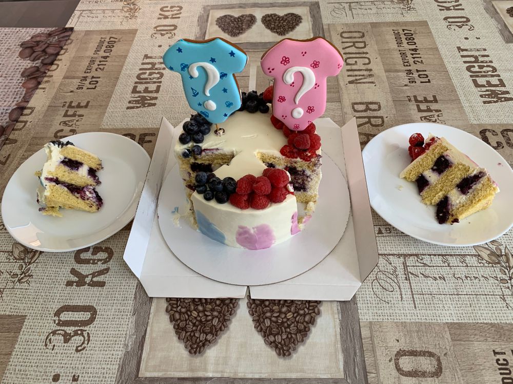 Неделю назад были на Узи в Кулакова, доктор спросила хотим ли узнать пол малышей)) поскольку старшие сразу нас предупредили, что хотят гендер-пати, мы попросили написать пол на бумажке, запаковать ее и отдать нам в таком виде. Полноценную вечеринку с гостями устраивать не было ни сил, ни времени, поэтому решили провернуть все в кругу семьи. Заранее у меня была договорённость с кондитером, которая печёт ПП торты без сахара и белой муки, чтобы можно было попробовать и мне (ГСД) и всем детям)) решили с ней, что голубика в начинке будет означать мальчиков, клубника - девочек, ну и 50/50 если оба варианта)) вот сегодня нам привезли наш тортик! Какой же он необыкновенно красивый и вкусный оказался!!