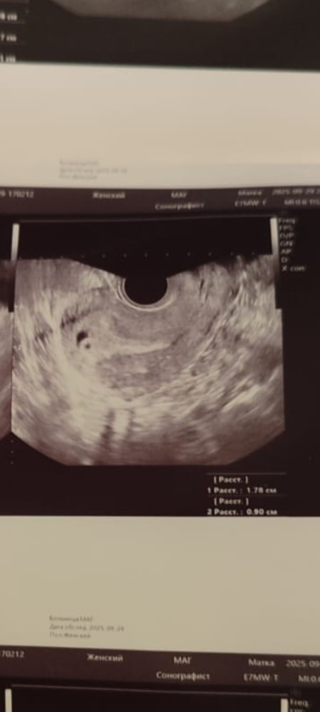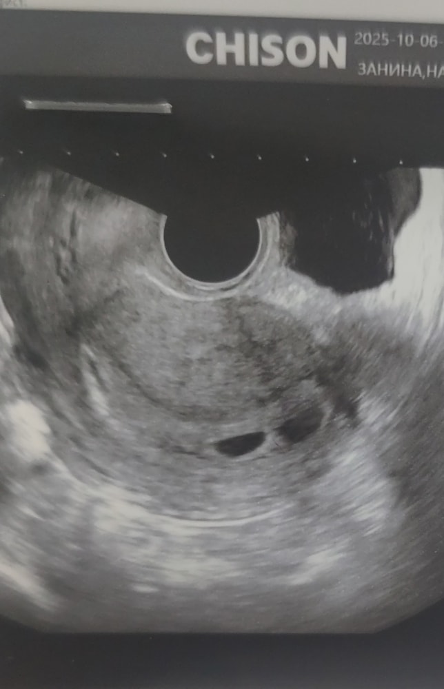 Через неделю пришла на УЗИ снова. Акушерский срок 6 недель -- ожидали увидеть эмбрион, но на экране только плодное яйцо. Узистка говорит: похоже, беременность не развивается. А потом приглядывается и находит по соседству ещё одно "пятнышко".