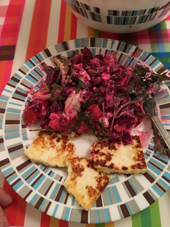 Салатик: свёкла нарезаная кубиками, руколла, помидорки черри, сербская брынза, заправляется лимоном и оливковым маслом. К салату у меня жареный адыгейский сыр.