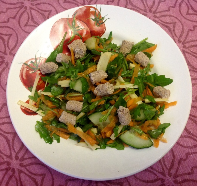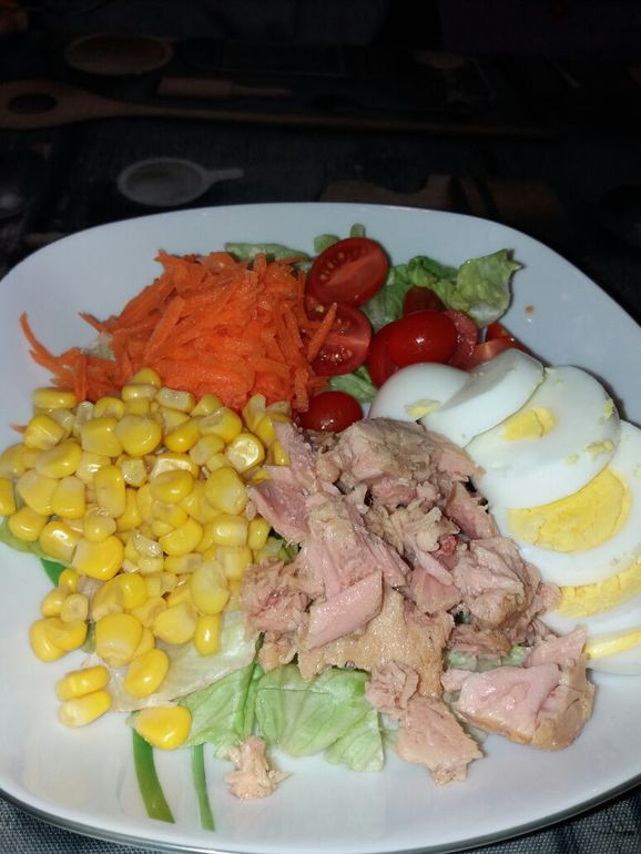 Вдохновение. Очень хотелось есть, бежала домой и забежала в магазин. Пытаюсь питаться правильно и поэтому на готовые салаты в магазине только смотрю. Смотрю, смотрю.. И вдруг вижу приятный салатик и состав чудесный. Вот этот салат и вдохновил меня сделать все самой. Так правильно. И им питаться.