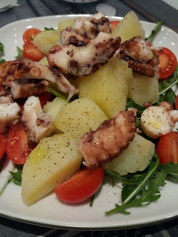 Вот этот теплый салат с картошкой и осьминогом из этой оперы. Осьминог варится 30-40 минут, потом режется на небольшие кусочки, смешивается с вареной картошкой, капля оливкового масла и получается вкуснейшее блюдо итальянской кухни))))